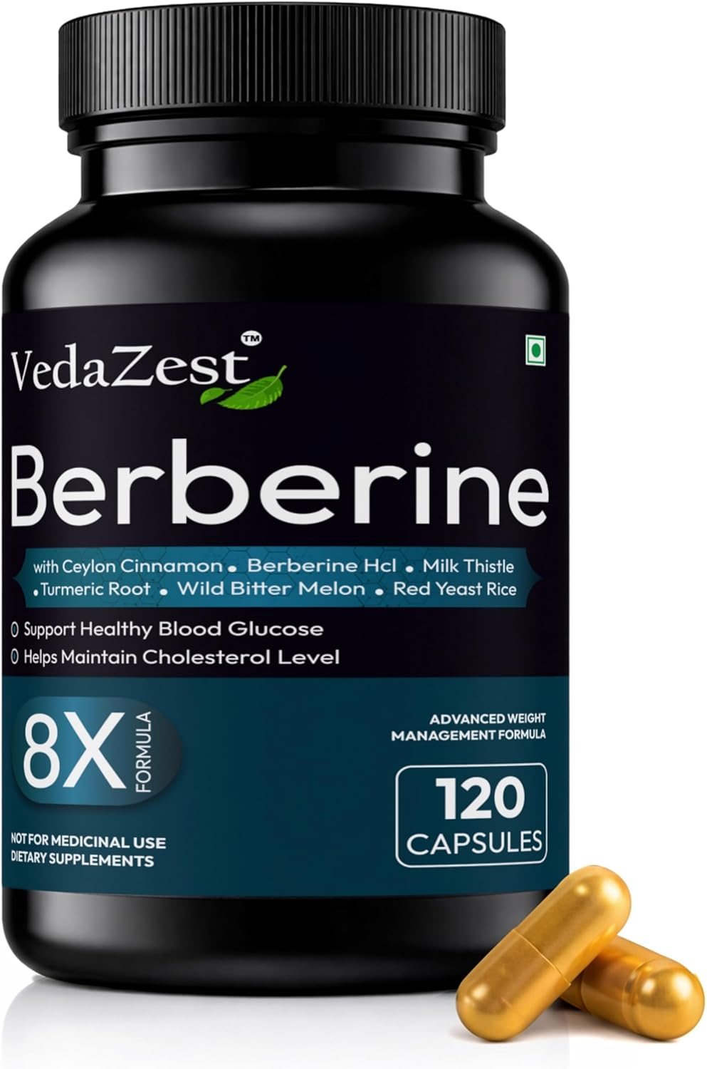 Berberine 120 Vegetarian Capsules with Ceylon, Milk Thistle, Turmeric Root, Wild Bitter Melon and Red Yeast Rice | 8X Formula Supplement Non-GMP and Gluten Free