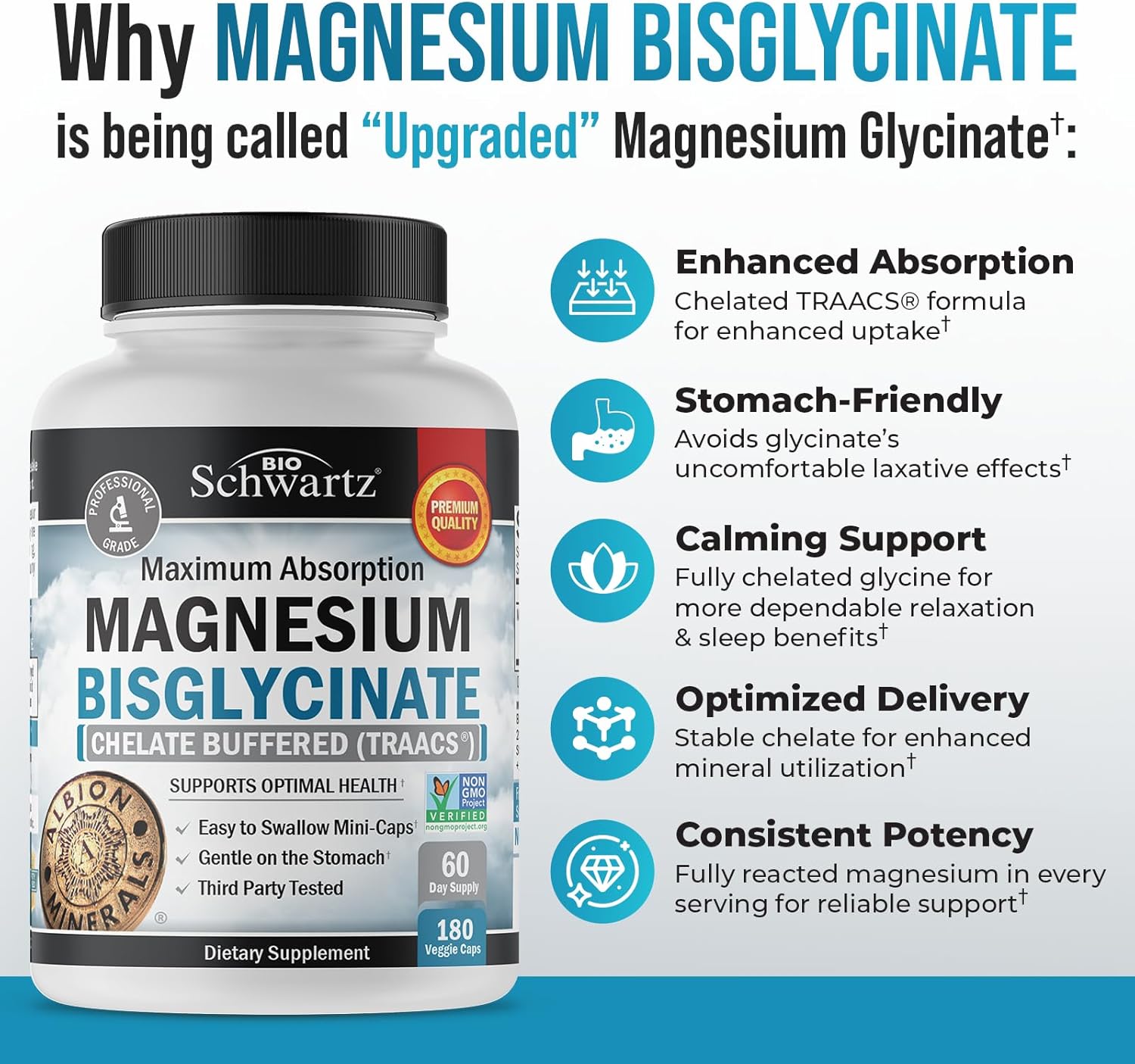 Magnesium Bisglycinate Chelated Supplement - High Absorption Magnesium Glycinate Supplement for Women and Men - Sleep, Muscle, Bone & Joint Support - Non-GMO, Non-Laxative Chelate - 180 Capsules