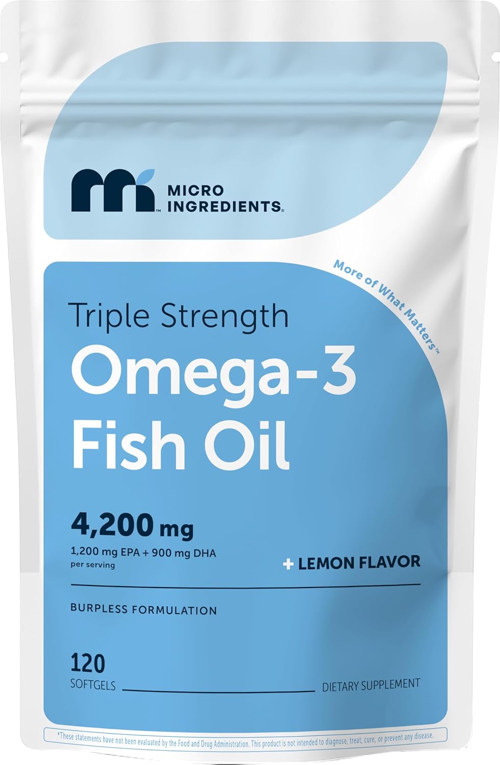 Micro Ingredients Triple Strength Omega 3 Fish Oil Supplements 4200mg Per Serving, 120 Softgels – Lemon Flavored – Burpless | EPA 1200mg + DHA 900mg | Deep Sea Fish